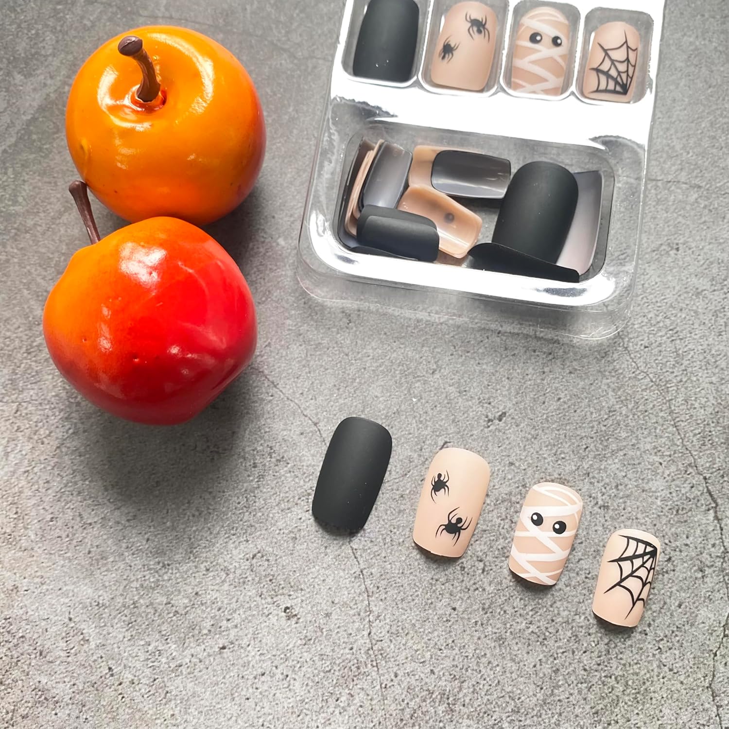 Elevate your Halloween look with these Black Short Square Press On Nails featuring spider web and mummy designs. The set includes 24 nails in 12 sizes with jelly glue for easy application. Made from safe, flexible materials, these nails are reusable, waterproof, and perfect for parties, dates, or festive occasions.